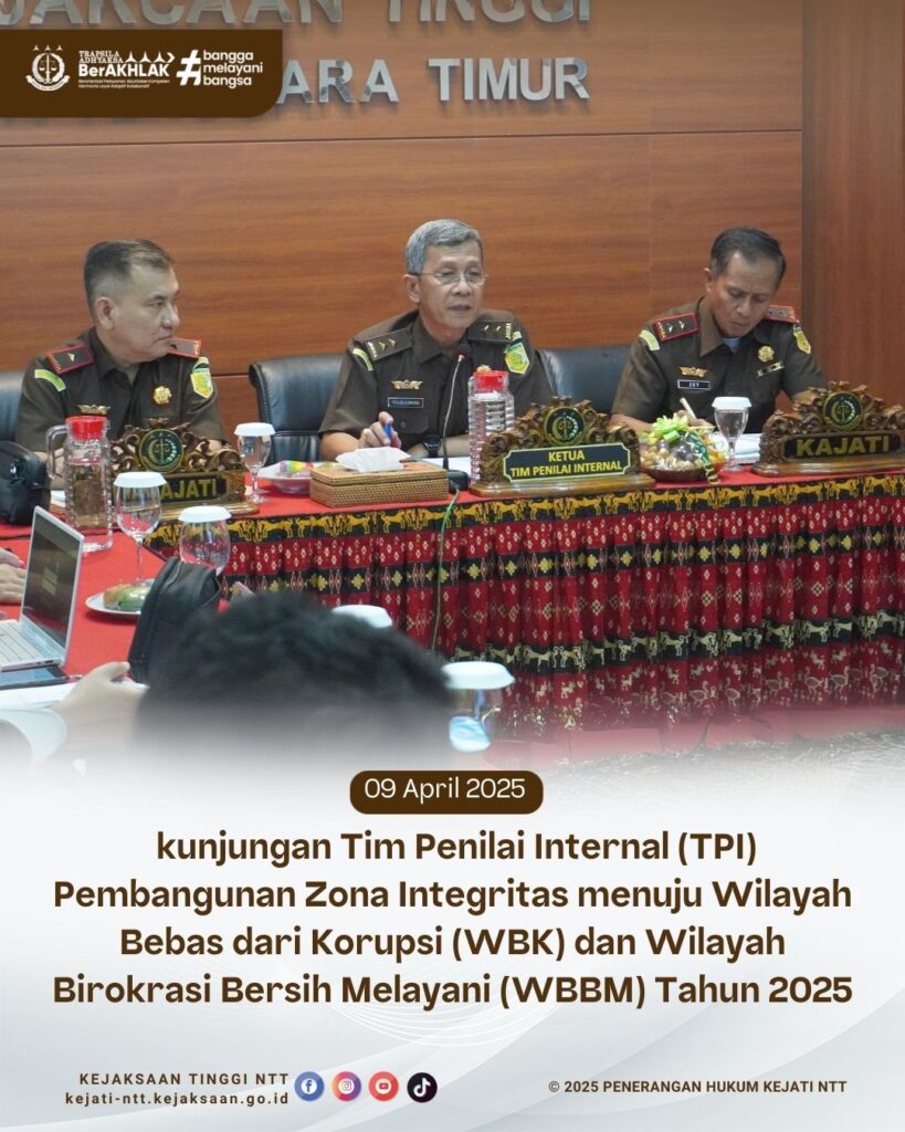 Kupang, 9 April 2025 – Kejaksaan Tinggi (Kejati) Nusa Tenggara Timur (NTT) menerima kunjungan Tim Penilai Internal (TPI) Pembangunan Zona Integritas menuju Wilayah Bebas dari Korupsi (WBK) dan Wilayah Birokrasi Bersih Melayani (WBBM) Tahun 2025 dari Jaksa Agung Muda Pengawasan Kejaksaan Agung RI. Kunjungan ini dilakukan pada Rabu (9/4/2025) untuk mengevaluasi perkembangan reformasi birokrasi di lingkungan Kejati NTT.